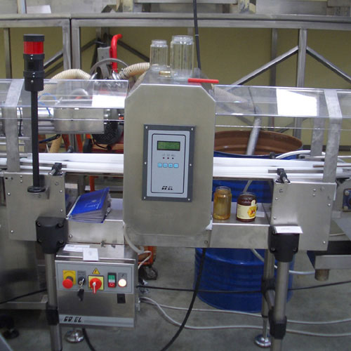 Metal detector for quality checks on hnoey jars. Structure made interely of AISI304 stainless steel. Accessories: Acoustic and audible units, Lexan protections against falling objects